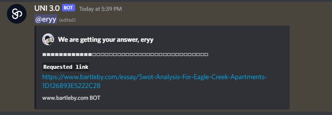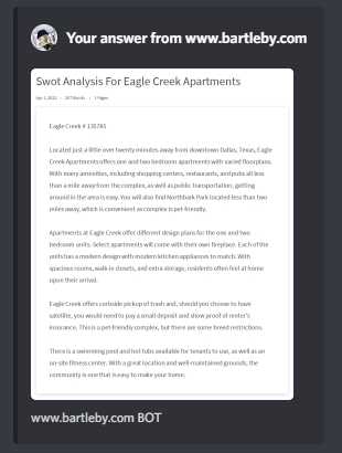 Example Request in chat: https://www.bartleby.com/essay/Swot-Analysis-For-Eagle-Creek-Apartments-1D126B93E5222C2B